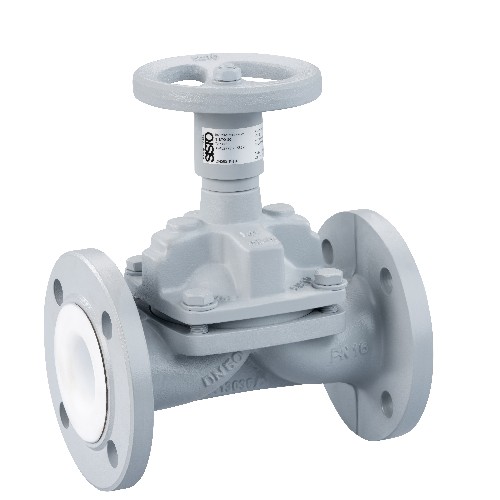Weir-type diaphragm valve to DIN/EN with flanged ends, threaded socket ends or socket weld ends, in straight-way pattern; shut-off and sealing to atmosphere by supported and confined diaphragm; body with coating or lining, position indicator with integrated stem protection. All moving parts are separated from the fluid by the diaphragm. Maintenance-free.