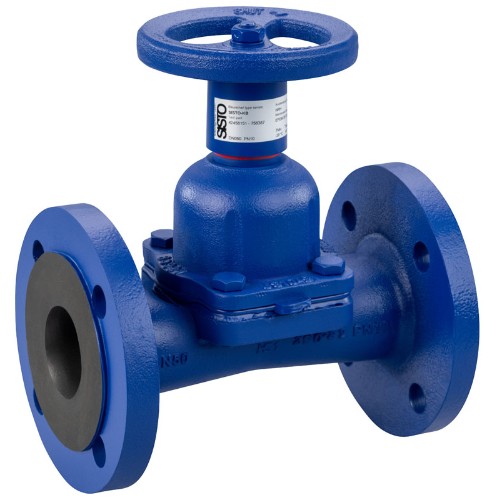Diaphragm valve to DIN/EN with flanged ends, in straight-way pattern; shut-off and sealing to atmosphere by diaphragm; hydraulically favourable full bore body with coating or lining, position indicator with integrated stem protection. From DN 125 with threaded bush. All moving parts are separated from the fluid by the diaphragm. Maintenance-free.